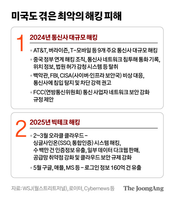 22일 로이터, 뉴욕타임스(NYT) 등 외신 보도와 백악관 브리핑 등을 종합하면 미국은 지난해 버라이즌 등 9개의 통신사가 대규모 해킹을 당했다. 미 정부는 중국 정부와 연계된 해킹 조직이 1년 이상 통신사 네트워크에 침투해 이용자 통화기록, 위치 정보, 법원이 허가하는 감청 시스템까지 탈취된 것으로 의심하고 있다. 미 연방수사국(FBI)은 해당 해커조직이 2021년부터 통신·운송·숙박 업체 등에 침투해 조직적인 공격을 벌였다는 보고서를 냈다. 통신사 뿐 아니라 클라우드 기업 오라클은 자체 통합인증(싱글사인온) 시스템이 해킹 돼 수백만 건의 인증 정보가 유출됐다. 오라클은 피해를 인정하지 않았지만 다크웹에 고객 인증 데이터 판매 글이 올라오자, 오라클은 구형 서버 해킹만 인정해 비판받기도 했다.