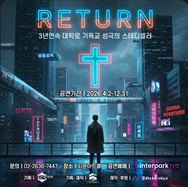 반기독교적 정서가 팽배한 대한민국 문화예술의 메카 대학로에서, 기독교 신앙의 본질을 담아낸 성극(聖劇) 한 편이 3년 연속 무대에 오르며 영적 기류를 바꾸고 있어 화제다. 연극 ‘리턴(Return)’이 오는 2026년 2월 11일(수) 일산광림교회에서 2026년 공연의 시작을 알리는 공식 출범식을 개최한다. 이번 공연은 단순한 연극 무대를 넘어, 침체된 기독교 문화계에 새로운 활력을 불어넣고 복음 전파의 강력한 도구로 쓰임 받을 것으로 기대를 모으고 있다.