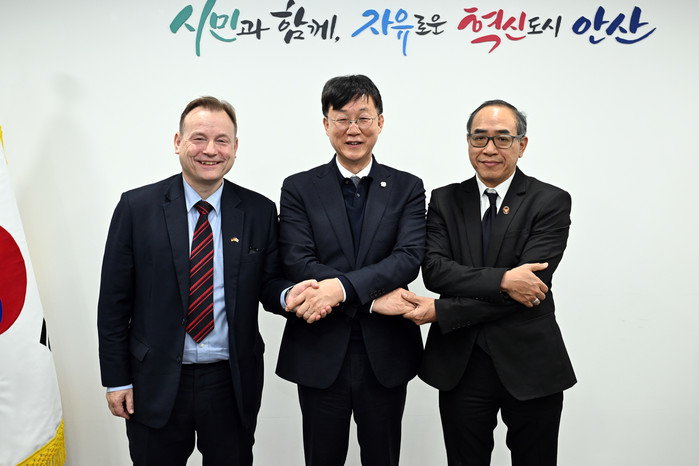 | ▲ 이민근 안산시장(사진 가운데)이 4일 게오르크 슈미트 주한독일대사(왼쪽)와 타니 생랏 주한태국대사(오른쪽)과 손을 맞잡으며 기념 촬영을 하고 있다. 안산시 제공 |