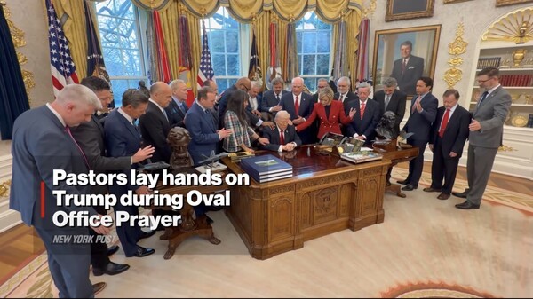 소셜 미디어에 공유된 영상에는 ‘결단의 책상(Resolute Desk)’에 앉은 트럼프 대통령 주위로 여러 목회자와 복음주의 지도자들이 둘러서서 그의 어깨에 손을 얹고 안수하며 지혜와 보호를 구하는 기도를 드리는 모습이 담겼다.